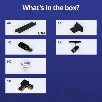 | Nome del fabbricante | Complete L shaped 1-Phase Track Set Black incl. 5x Spot fixture + GU10 2700K 3W Dim – 1,5 x 1,5 mete | |