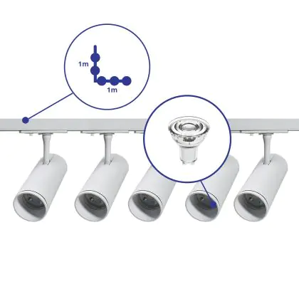 | Nome del fabbricante | Complete L shaped 1-Phase Track Set White incl. 5x Spot fixture + GU10 2700K 3W Dim – 1 x 1 meter i | |
