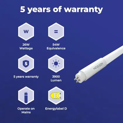 Il Noxion Tubo LED T5 Avant Extreme (Mains AC) High Output 26W 3900lm - 840 Bianco Freddo | 115cm - Sostitutiva 54W è un tubo LED perfetto per sostituire gli standard tubi fluorescenti di 54 W. Con questo tubo LED di Noxion ti assicuri una lunga durata e 5 anni di garanzia.