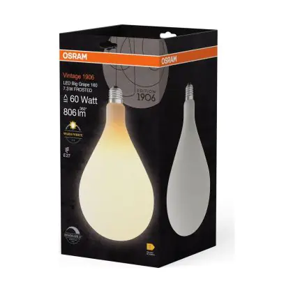 La Osram Vintage 1906 LED Big Grape E27 Filamento Ghiaccio 7.3W 806lm - 827 Bianco Molto Caldo | Dimmerabile - Sostitutiva 60W è la perfetta sostituzione per la tua lampada convenzionale 60W con attacco E27 grazie alla sua tecnologia LED. Passare a LED ti offrirà tanti vantaggi!