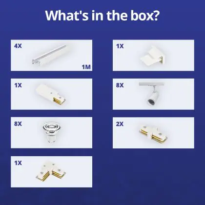 Descrizione Set completo 1-Fase Rail L 2 x 2 Metro Bianca | incl. 8x Faretti + GU10 2700K 3W Dimmerabile + Tappo Di Chiusura, Connettore di Alimentazione e L -Connettore